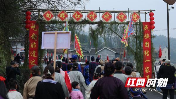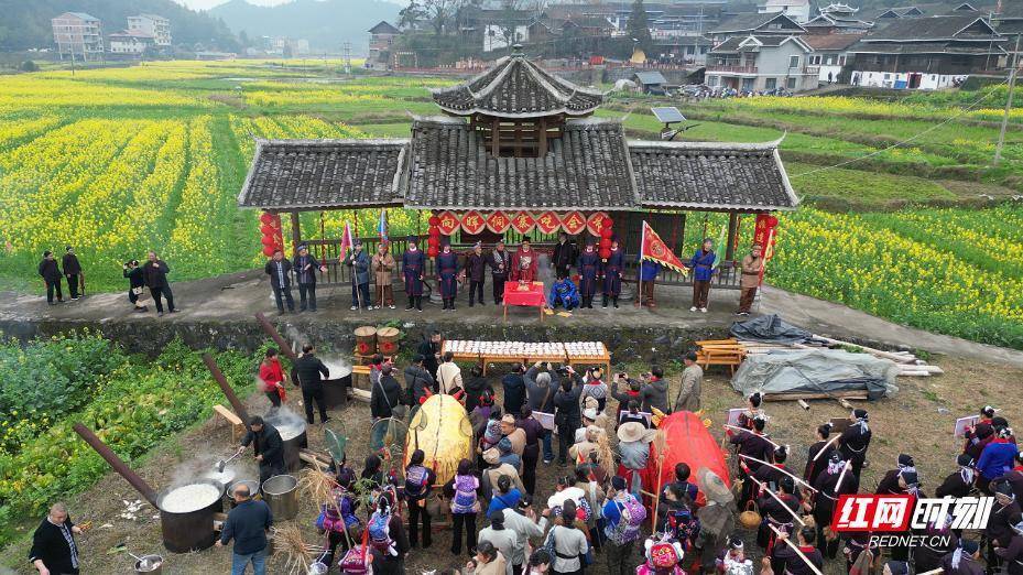 向晖村“吃会节”是当地独有的非遗传统习俗,始于宋代,由寨祖杨政岩为凝聚寨心、和睦邻里所创。每年正月召集族人和相邻团寨民众,汇聚到老寨河滩两棵古杉树下拜祭神灵,讲款、祈福、定规立约,再以大锅煮肉,开坛取酒款待乡邻。千年流转,这一习俗沿袭至今,成为侗家人新春祈福、联结情谊的重要载体。向晖村“吃会节”传承人杨雄梧表示,向晖村吃会节也叫“福寿庆会”,是我们村的传统节日,每年正月初六举办,四面八方的人都会过来聚在一起祭祀祈福,多噶多耶,吃刨汤,能让邻里关系更加友好,团寨和睦。