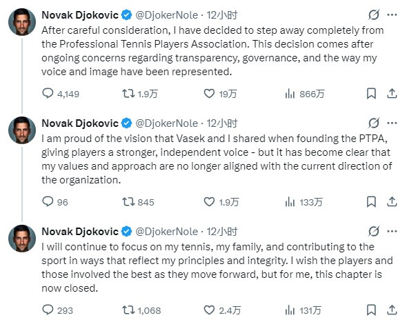 德约科维奇还在声明中表示,他将“继续专注于个人的网球事业、家庭,并以能够反映我的原则和诚信的方式为这项运动做贡献。我希望那些运动员以及相关人员在前行的路上一切顺利,但对我来说,这一篇章结束了”。